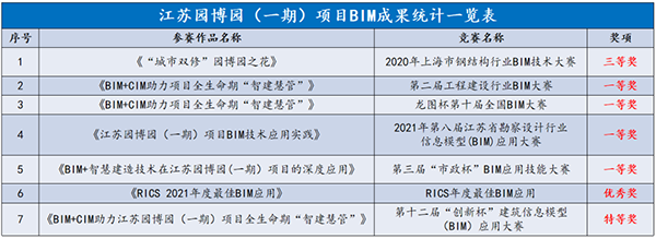 其中江蘇園博園(一期)項目榮獲“龍圖杯”國家級BIM成果1項,“上海市BIM大賽”等省部級BIM成果6項。