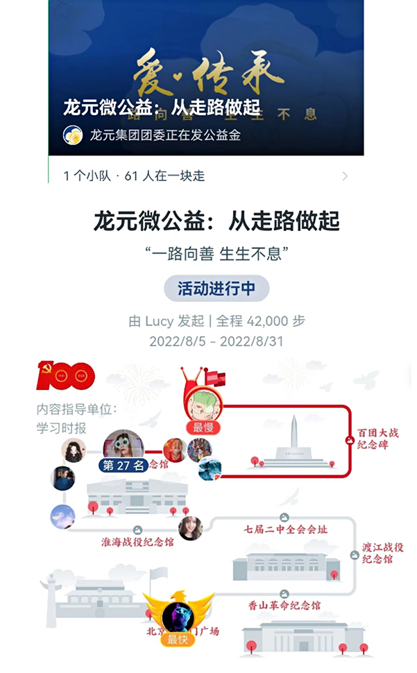 8月5日,集團團委發起“龍元微公益:從走路開始”公益捐步活動,重走紅色旅游地圖。此項活動將黨史學習教育、互聯網公益及企業文化緊密結合,創新活動形式,鼓勵龍元團員青年積極參與。捐步活動所產生的所有善款將專項用于“一億顆梭梭樹”項目,在阿拉善盟地區種下綠植,為助力“碳中和”貢獻龍元青春力量。